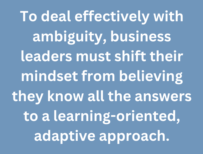 To deal effectively with ambiguity, business leaders must shift their mindset from believing they know all the answers to a learning-oriented, adaptive approach. This mindset includes:
