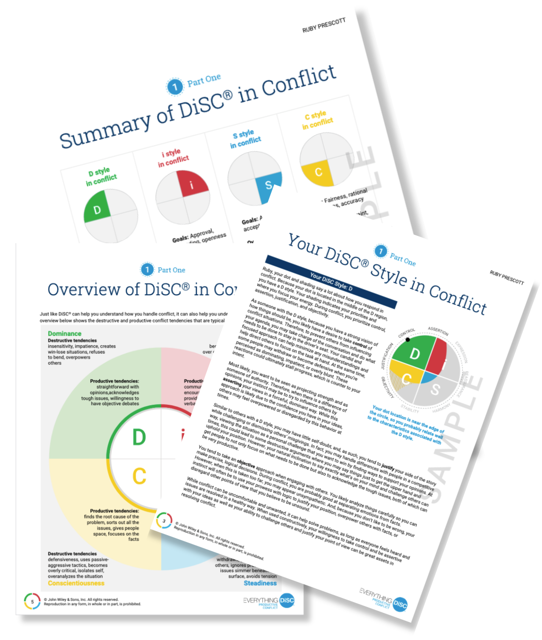 The DiSC Productive Conflict Profile assessment results are compiled into a detailed, 20-page report. This personalized report describes the destructive and productive conflict behaviors of each DiSC style and offers specific tips and strategies for improving their response to conflict situations.