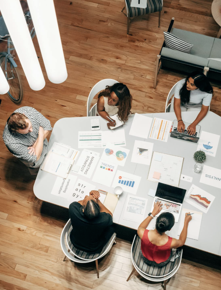An overhead view of a team working on a project, graphs and spreadsheets covering their shared table.